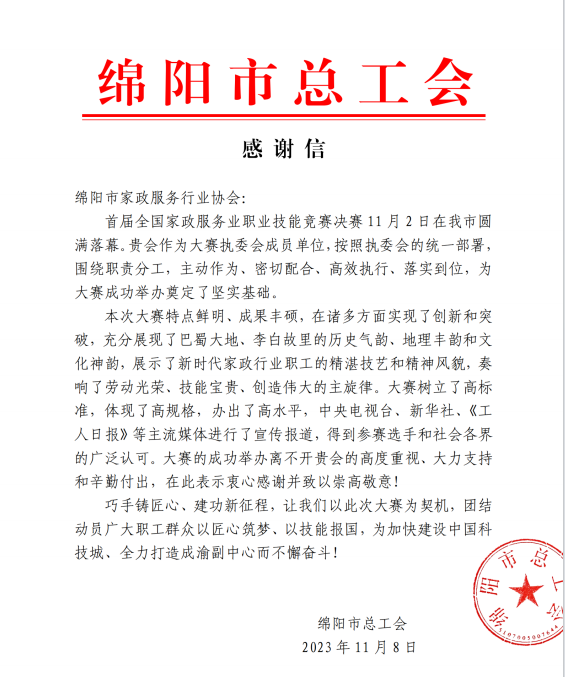 本次大賽特點鮮明、成果豐碩,在諸多方面實現(xiàn)了創(chuàng)新和突破,充分展現(xiàn)了巴蜀大地、李白故里的歷史氣韻、地理豐韻和文化神韻,展示了新時代家政行業(yè)職工的精湛技藝和精神風貌,奏響了勞動光榮、技能寶貴、創(chuàng)造偉大的主旋律。大賽樹立了高標準,體現(xiàn)了高規(guī)格,辦出了高水平,中央電視臺、新華社、《工人日報》等主流媒體進行了宣傳報道,得到參賽選手和社會各界的廣泛認可。大賽的成功舉辦離不開貴會的高度重視、大力支持和辛勤付出,在此表示衷心感謝并致以崇高敬意!